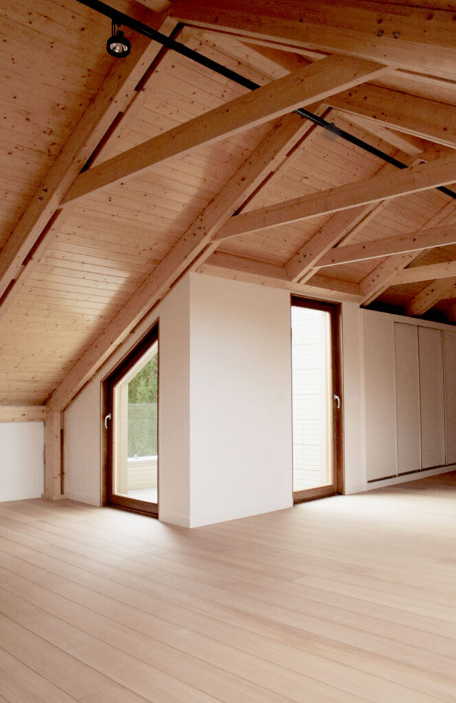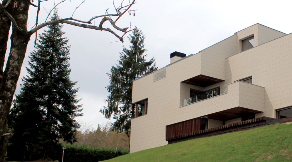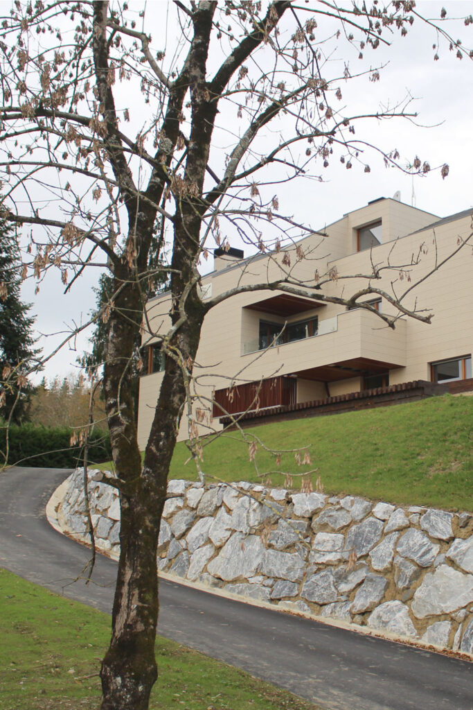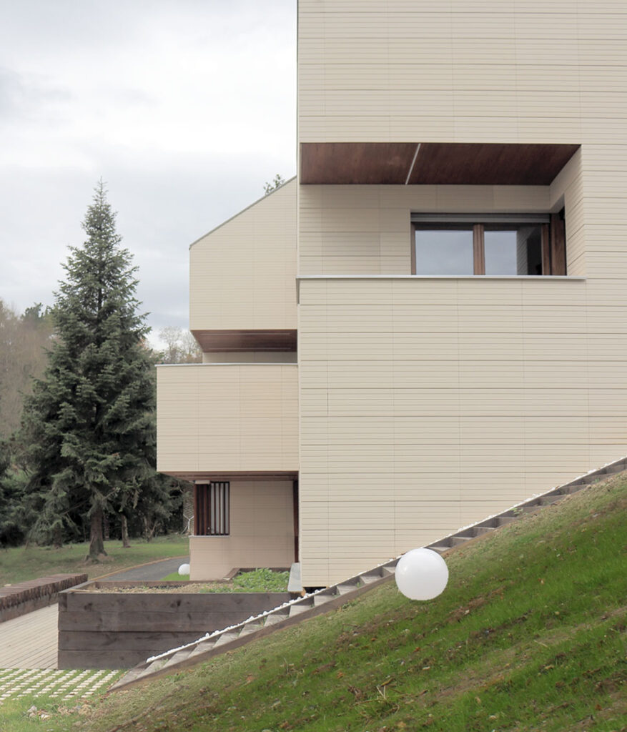 La vivienda, debía resolver un programa extenso organizado sobre una ladera soleada, rodeada de frondosos árboles, y abierta a vistas extraordinarias sobre el la ciudad y los montes del entorno. Por este motivo el edificio se articula, desde su condición de volumen compacto, para dar lugar a huecos y vuelos, que hacen permeables los cerramientos de la vivienda y aportan mayor contundencia plástica a la construcción.