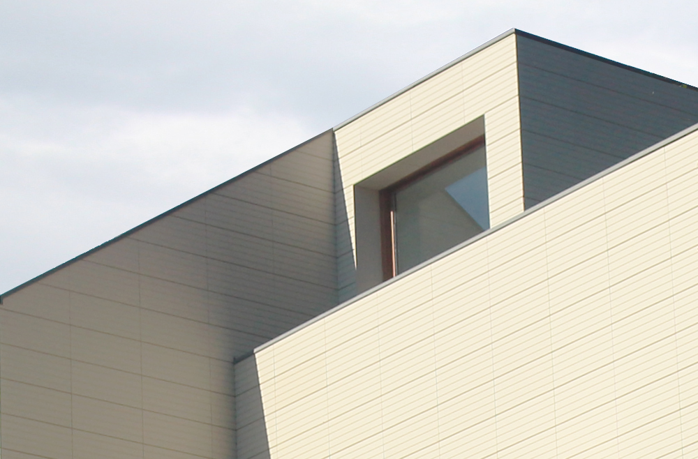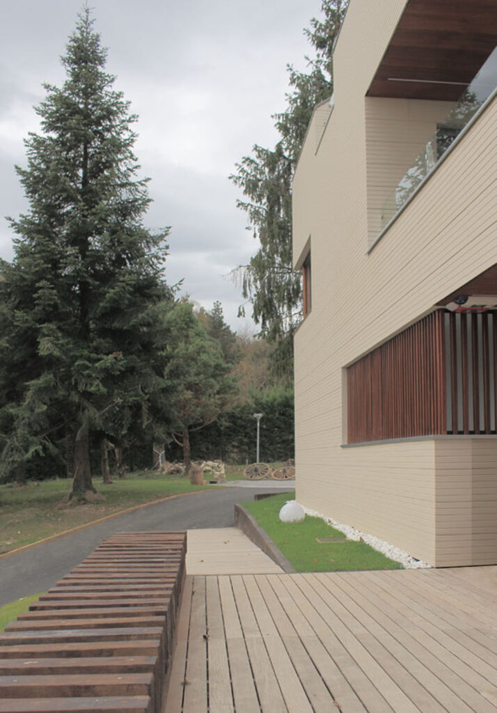 El edificio se resuelve mediante geometrías depuradas y materiales claros y tersos, que dan al conjunto una imagen netamente moderna, que contrasta con el uso de diversos elementos de madera natural, cubierta, ventanas, suelos, y celosías, que la identifican con la tradición constructiva.