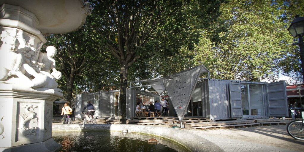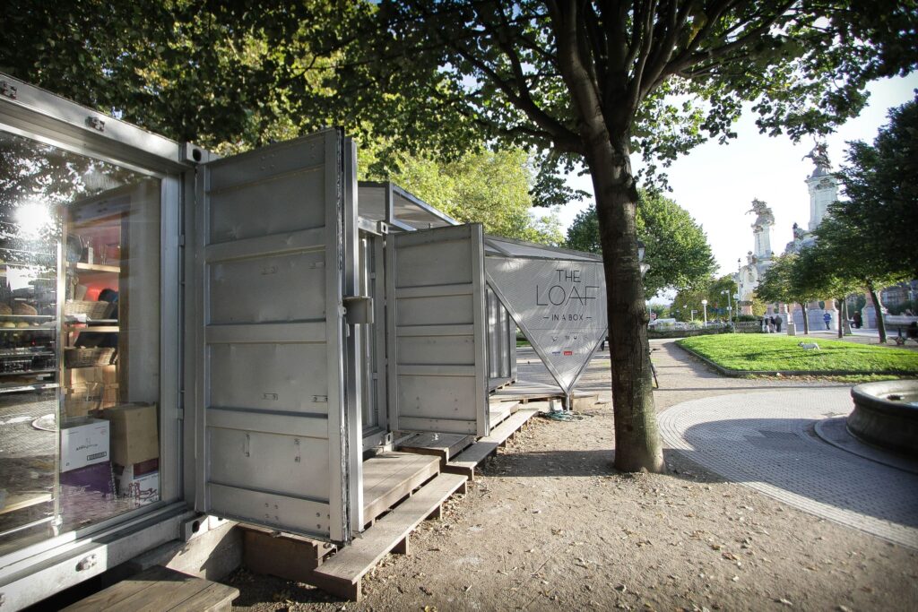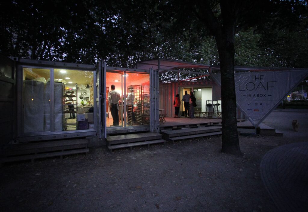 El proyecto, de bajo presupuesto, se construye con la premisa de la reutilización, así se adaptan 5 containers de transporte de 20 pies, que agrupados en 2 módulos contienen los usos de obrador de panadería y taller para cursos. También se reutilizan como cubierta material procedente de velas de barco y se modifican palets de madera para construir el suelo exterior que conecta esos 2 módulos.