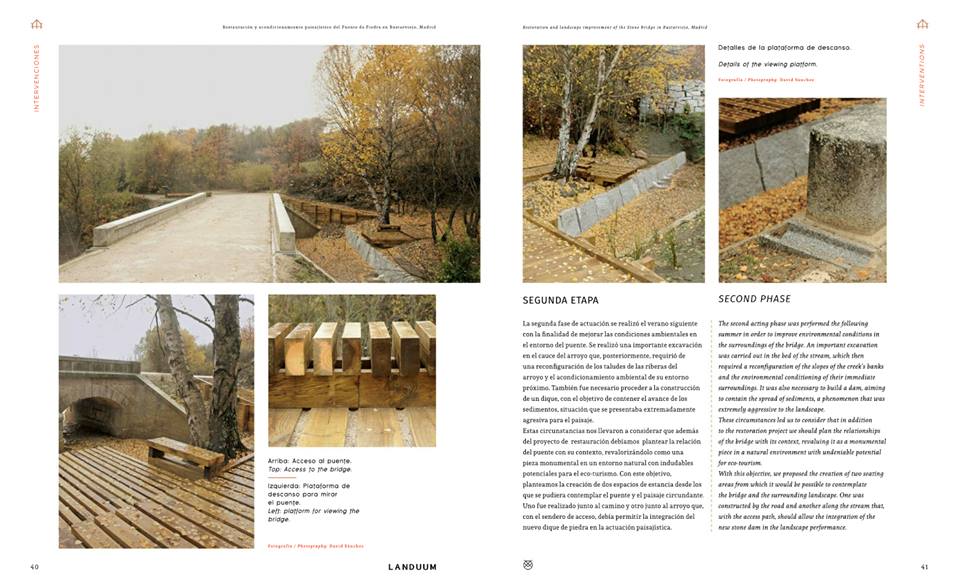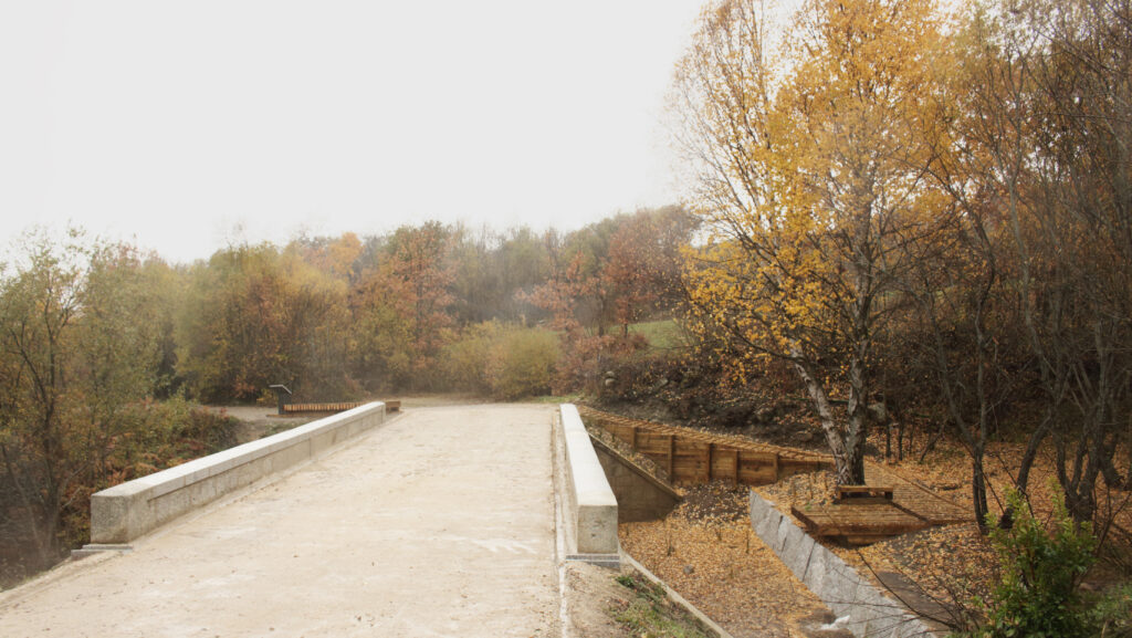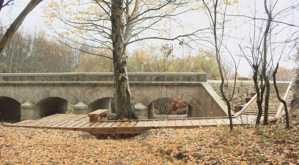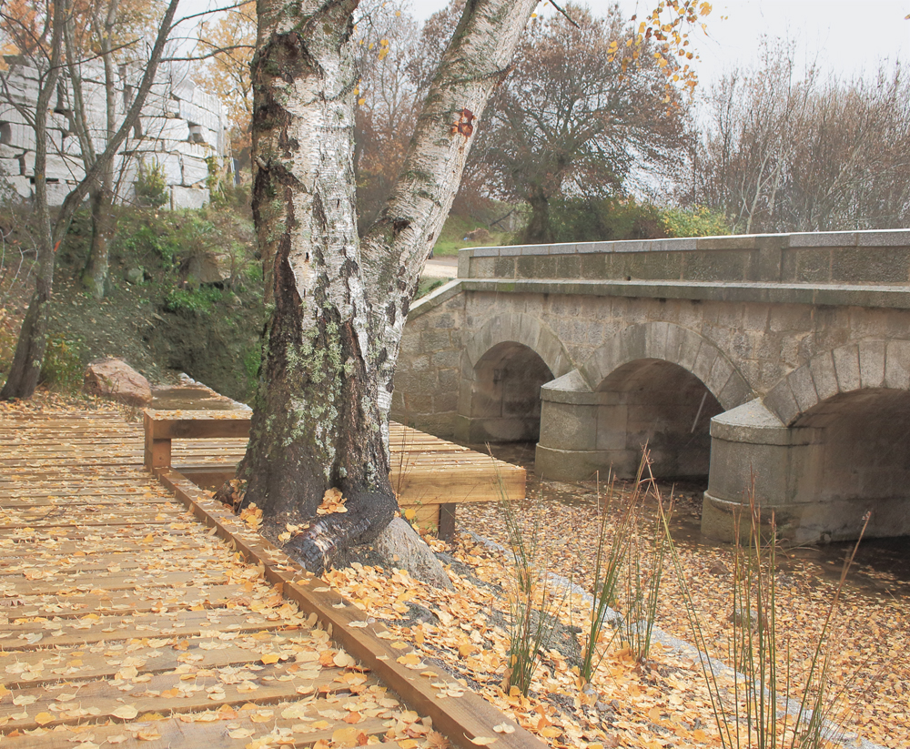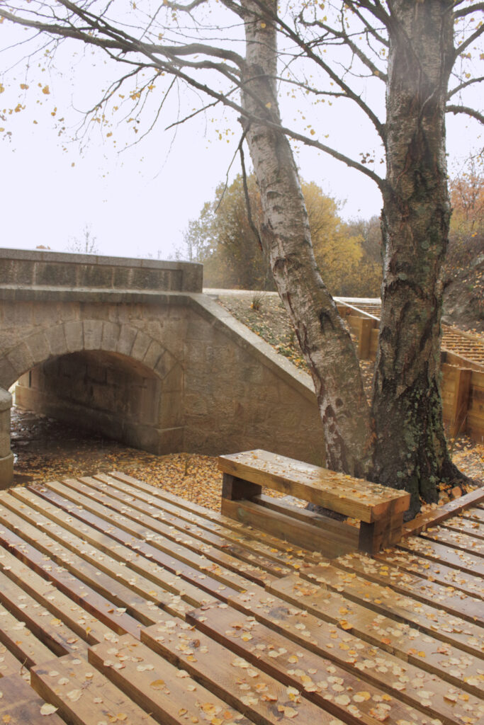 La regeneración ambiental y paisajística, tenía como objetivo recuperar el cauce fluvial próximo al puente, que tras décadas de abandono acumulaba gran cantidad de sedimentos en su base. Al hilo de esta operación, se decidió crear un espacio de estancia y descanso que sirviera de hito en un entorno natural surcado de sendas de gran interés ambiental y paisajístico, y que ayudara a establecer una relación más estrecha entre el monumento y el cauce del arroyo,