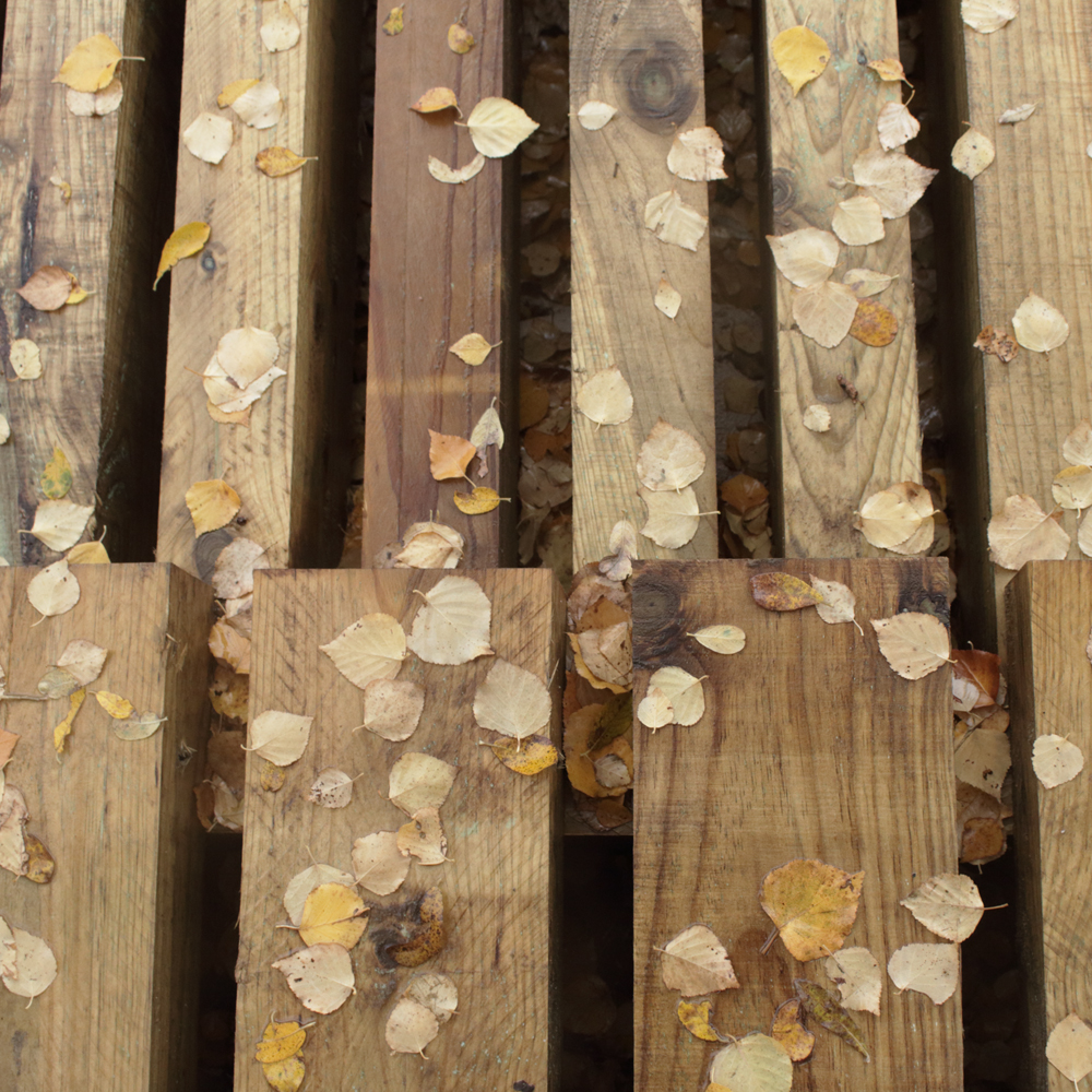 Ese material rudo, desnudo, de las eco-traviesas, era una de las imágenes intuitivamente buscadas, sin embargo posteriormente comprendimos que en realidad se trataba de un trabajo incompleto: le tocaba ahora a la proia naturaleza continuar el trabajo, deslavar la madera, retorcerla, astillarla, incrustarla de líquenes y sacar todos los matices posibles de una obra en constante evolución.
