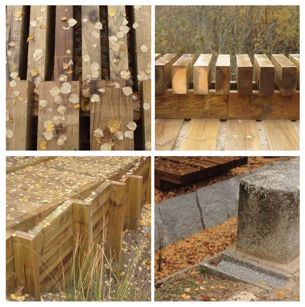 Constructivamente todos los elementos responden a un mismo sistema muy simple realizado casi exclusivamente con eco-traviesas de madera. Por economía de medios, y de tiempo, las variantes posibles del sistema se basan en las distintas posiciones de las propias piezas, colocadas unas veces de canto y otras de costado; apiladas o contrapeadas.